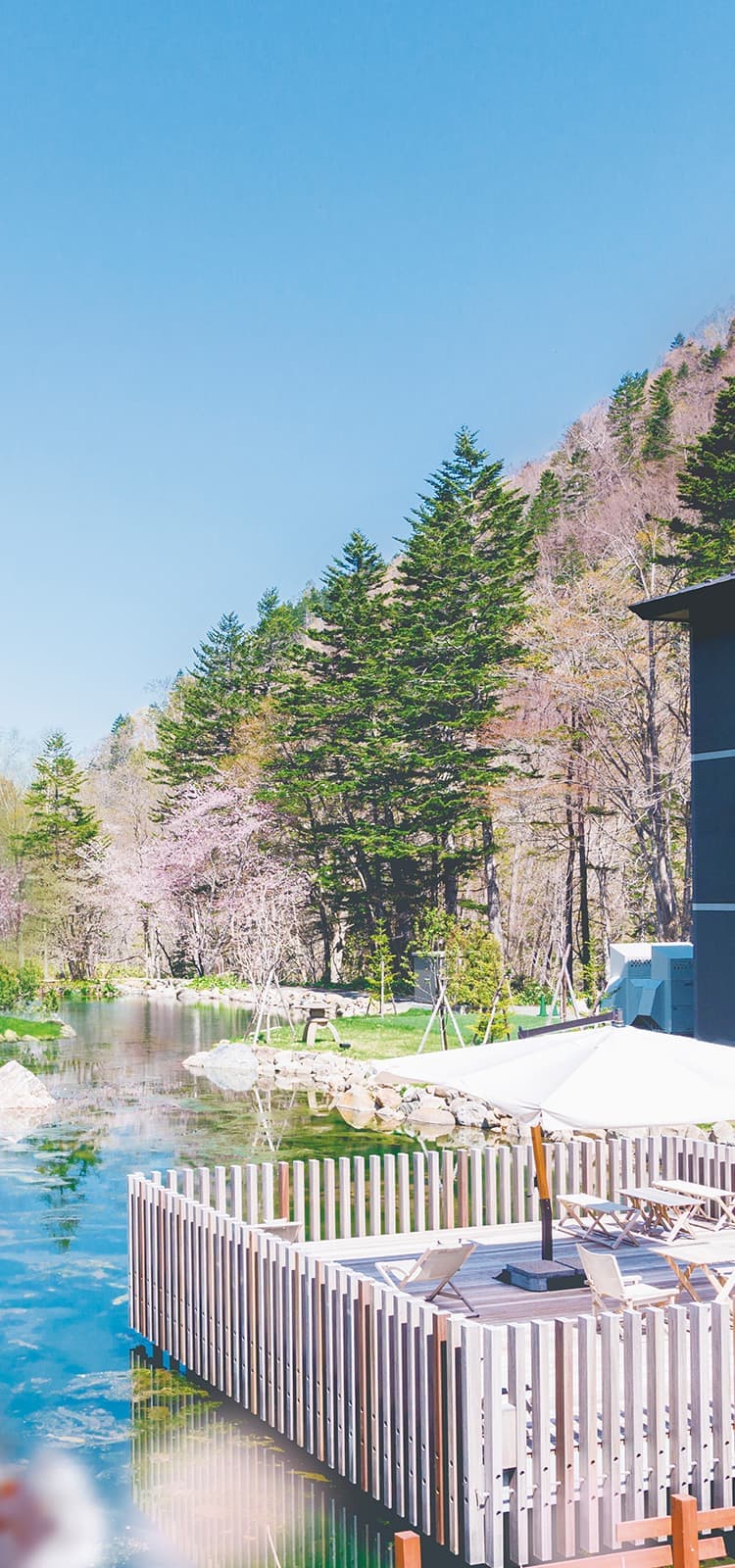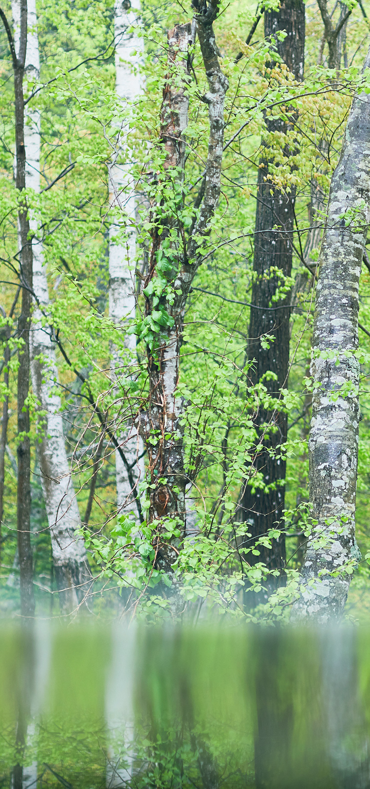 風が新緑と水面を揺らし、桜、紅葉、