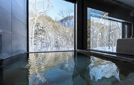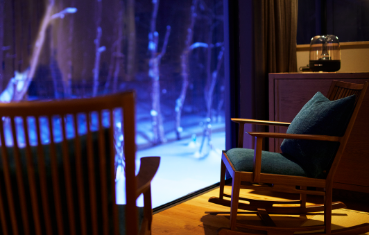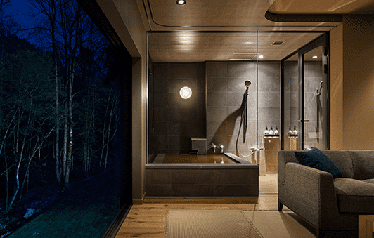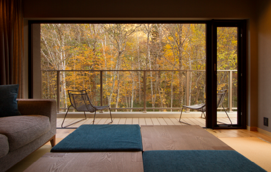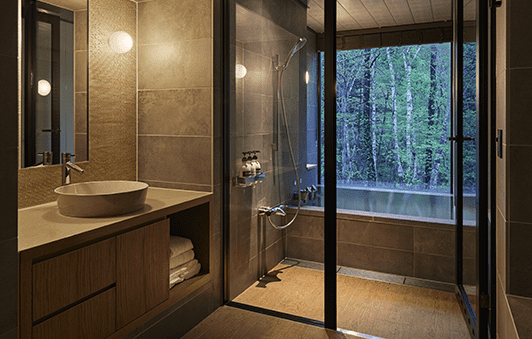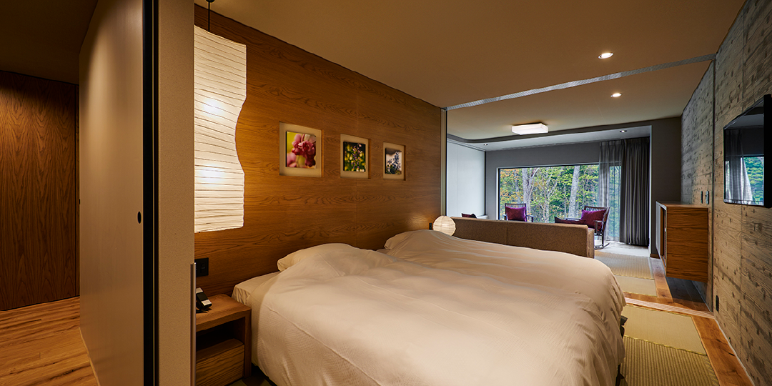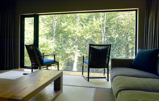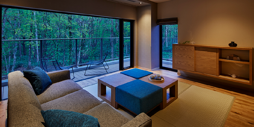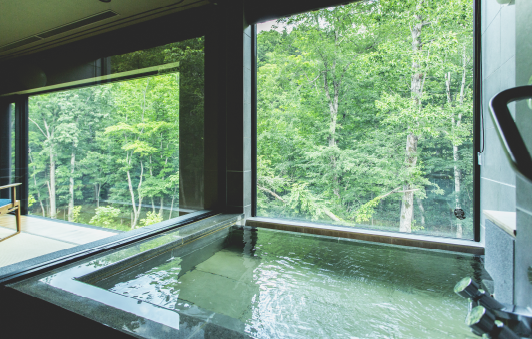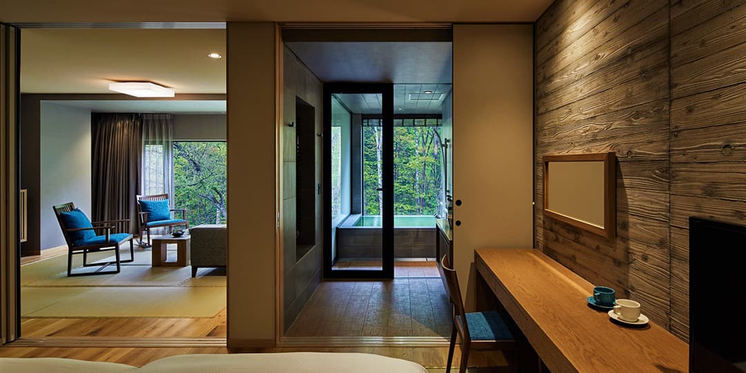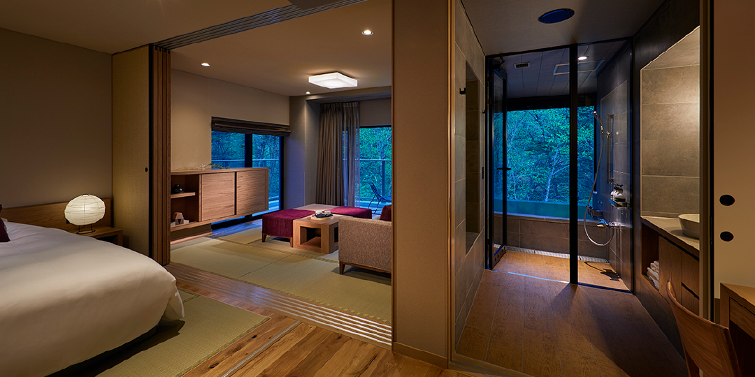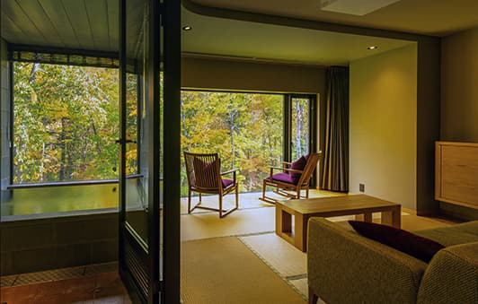 您可以在配備獨立的客廳和臥室、可眺望森林的觀景浴池的寬敞的